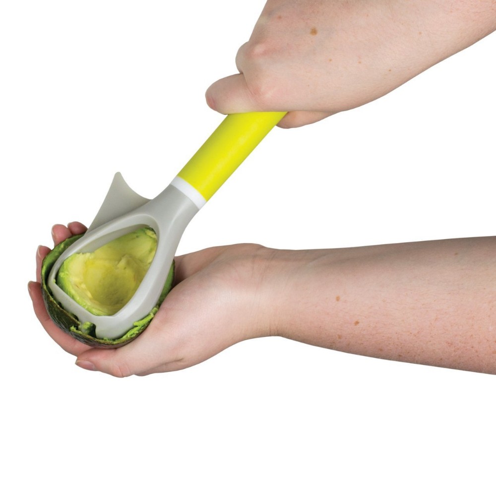 Sharp edge cuts the avocado in half.Removes seed and fruit by scooping
