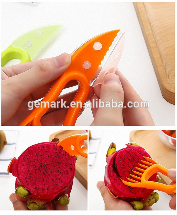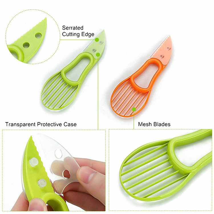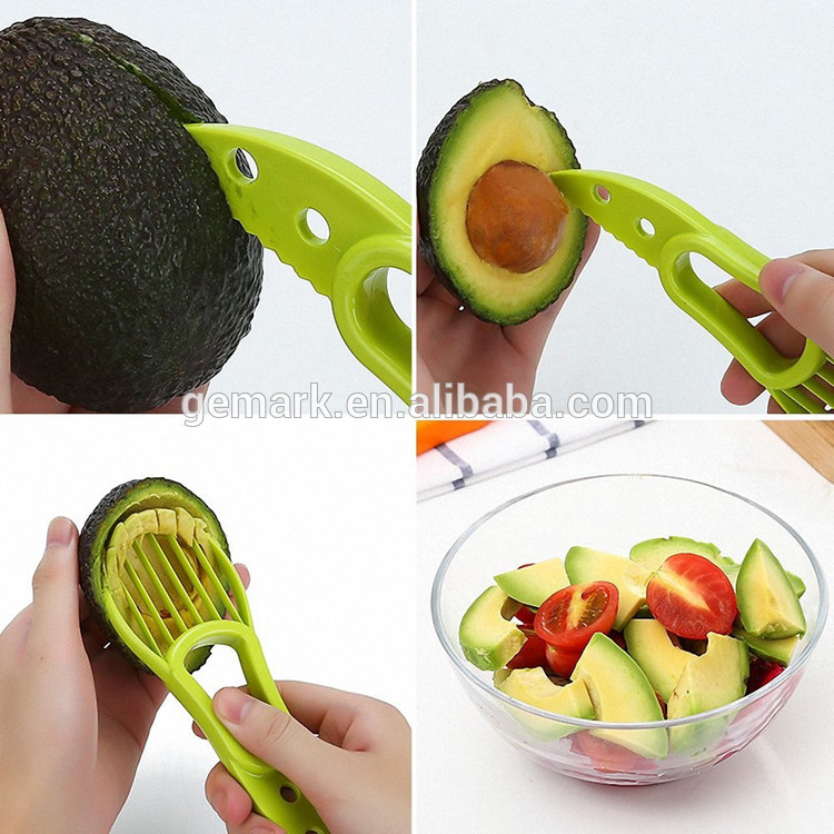 Sharp edge cuts the avocado in half.Removes seed and fruit by scooping