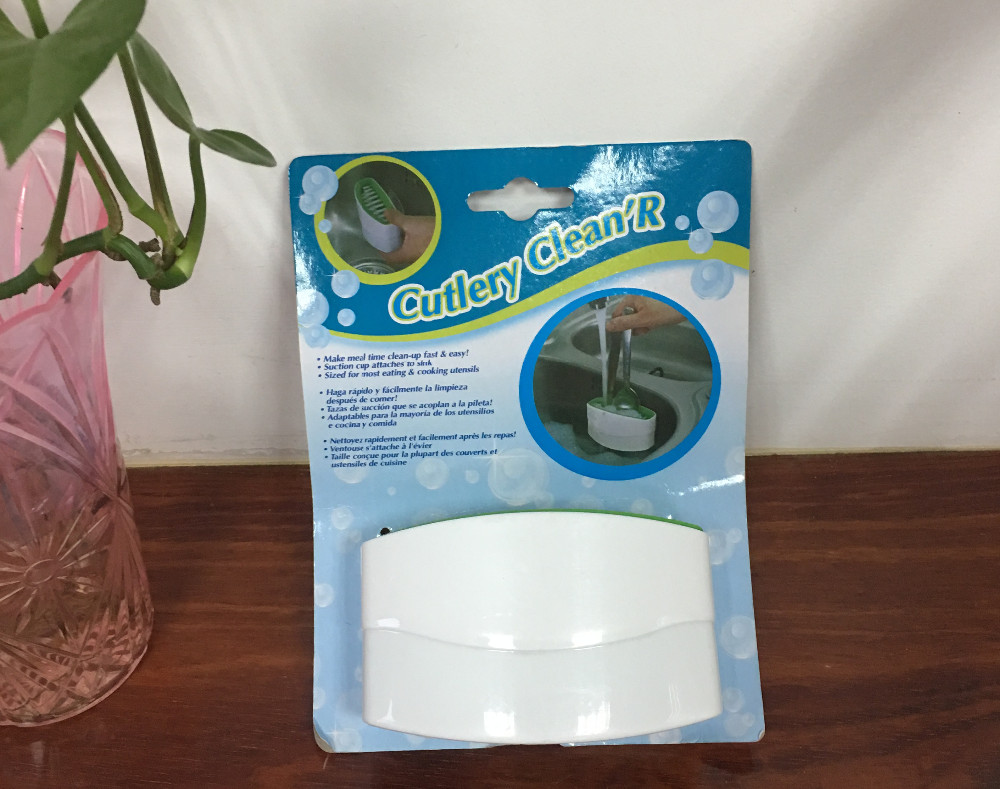 With suction cup on the back, can attach on sink wall, clean cutlery and etc.