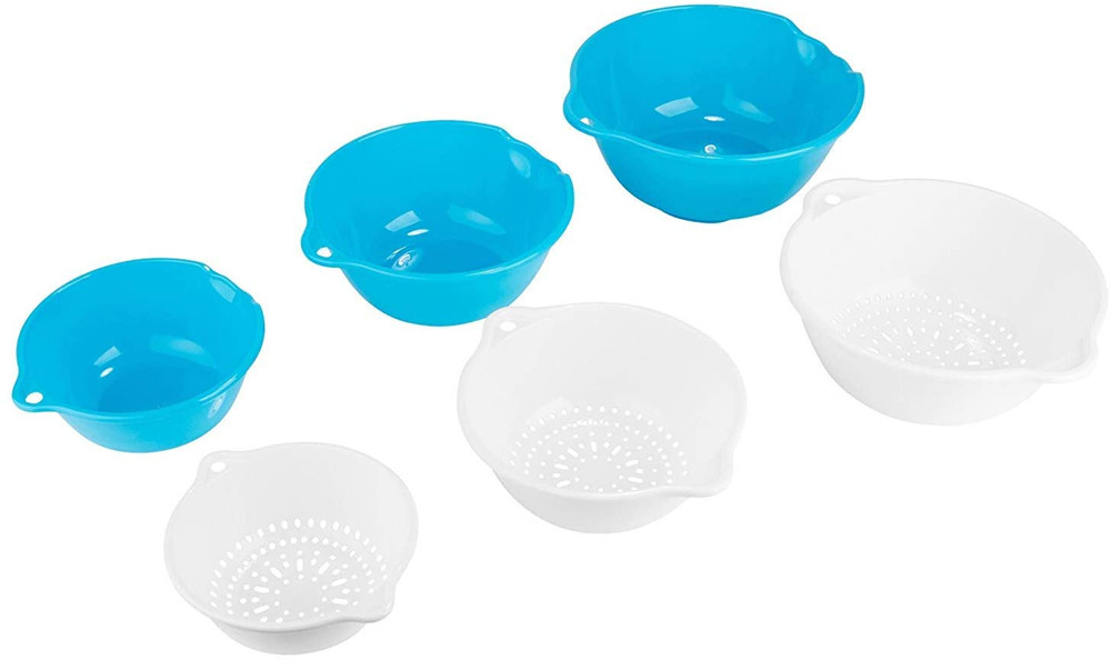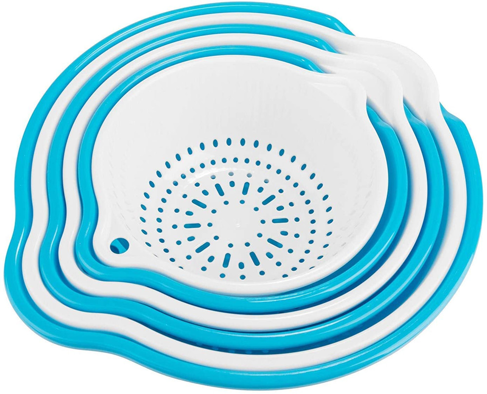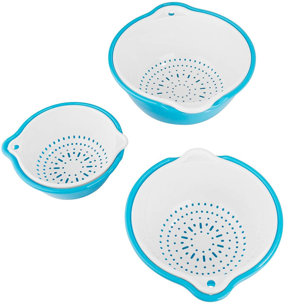 kitchen Strainer Colander Bowl Sets, Three Size Plastic Washing Bowl and Strainer, Space Saver for Fruits Vegetable Cleaning Washing Mixing, Blue and White