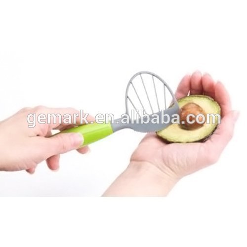 Use the serrated edge to open the avocado and the concave tip to remove the pit